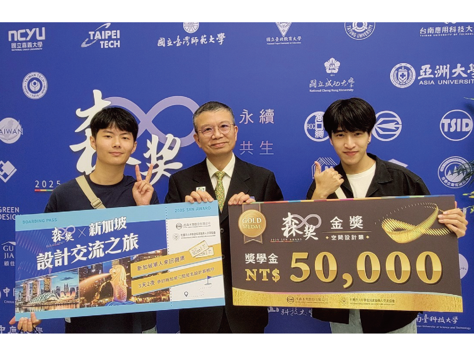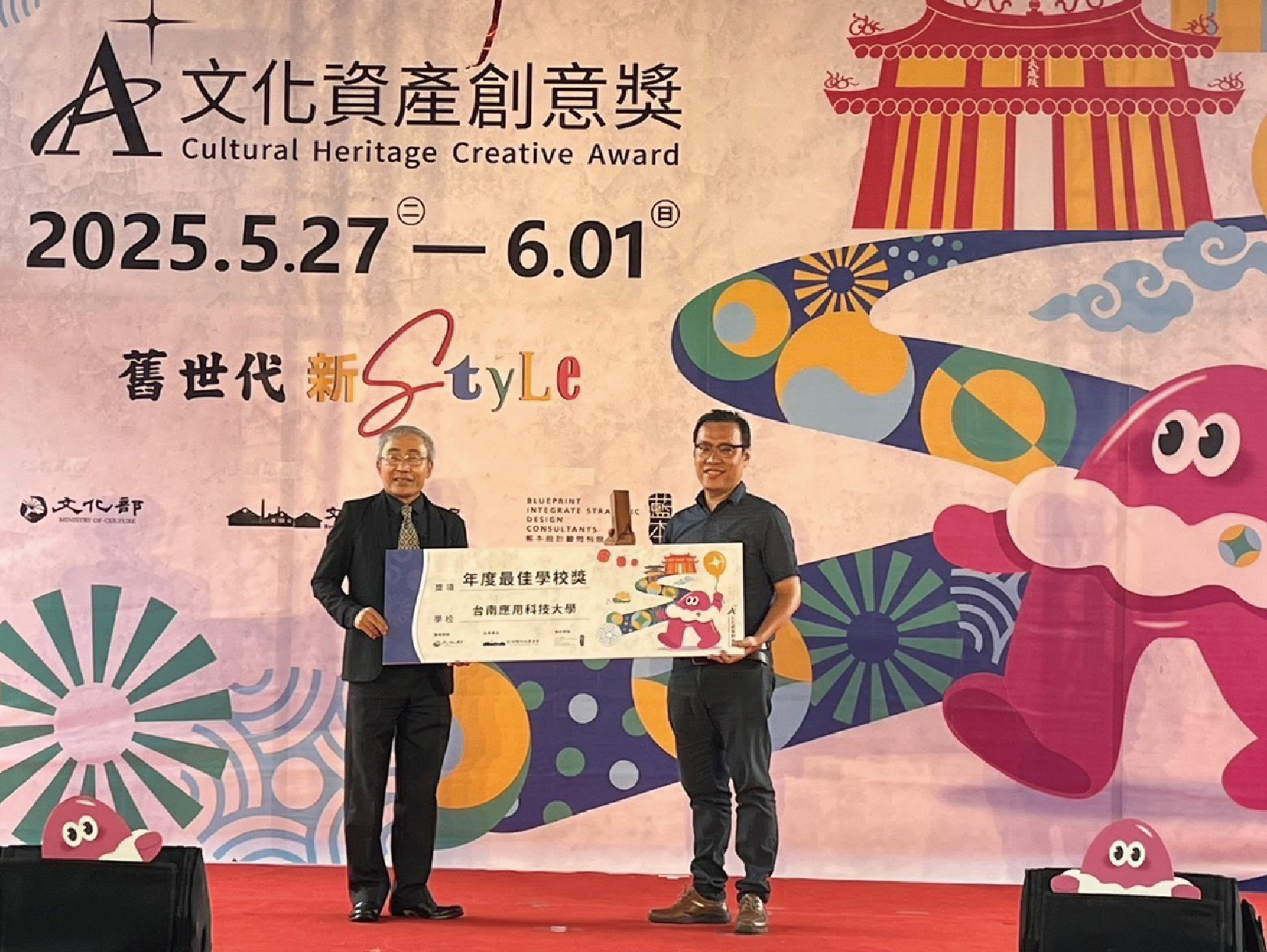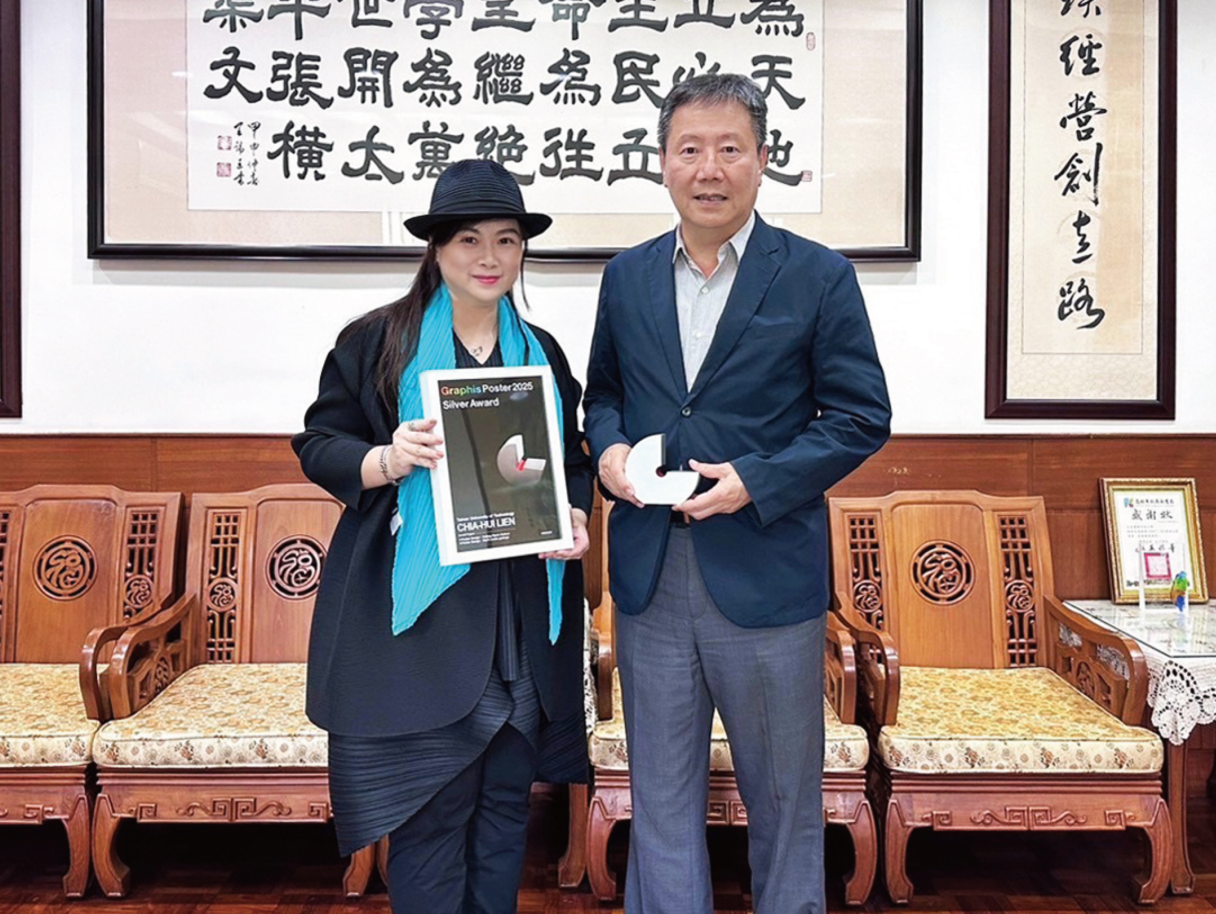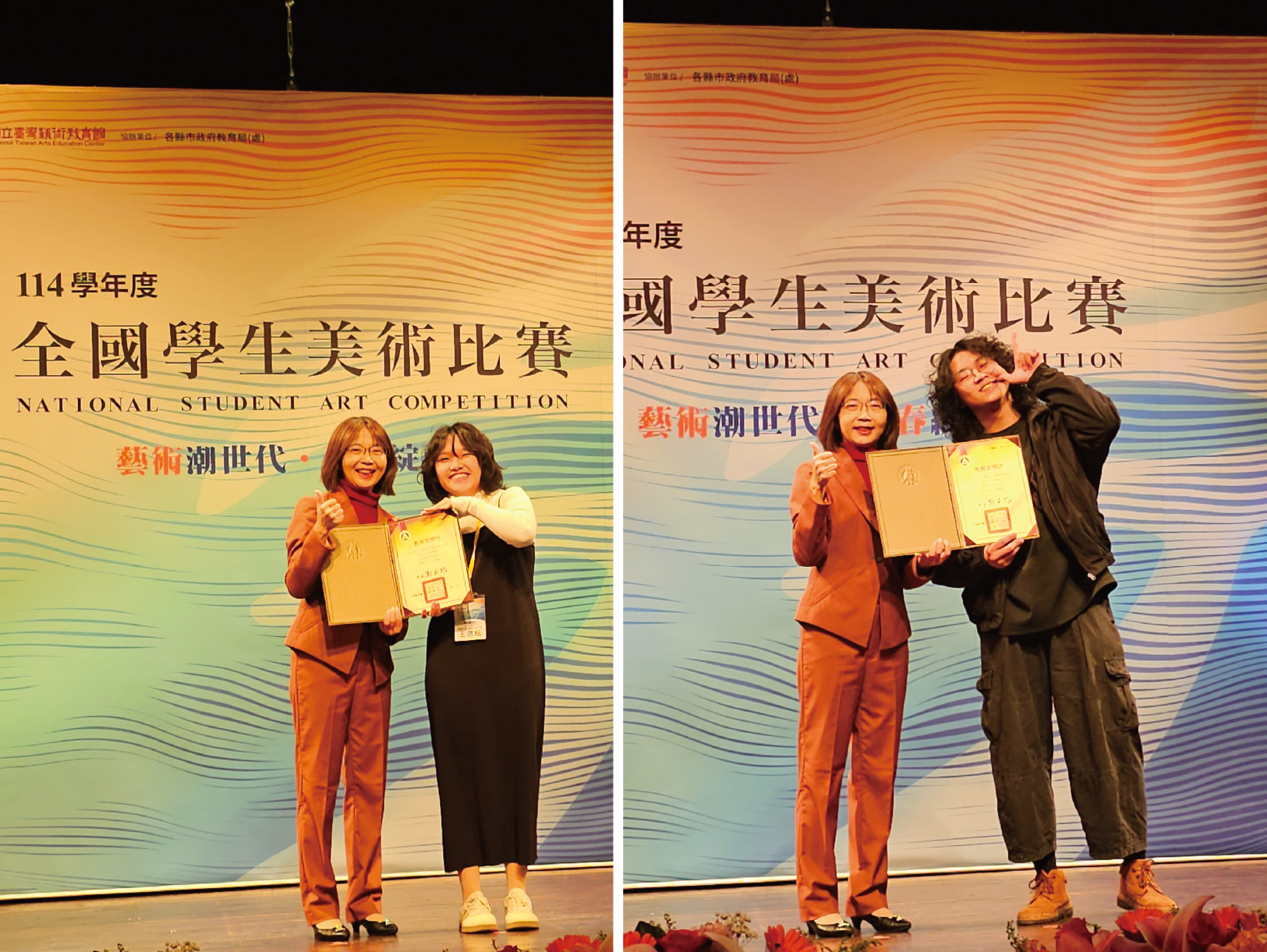 今年的比賽依舊是競爭激烈,台南應用科技大學(以下簡稱南應大)美術系的學生積極參加此比賽在114學年度全國學生美術比賽中共有15位同學榮獲佳績。頒獎典禮當日,南應大美術系榮獲水墨類大專組特優的王偲紜同學以及西畫類大專組特優的劉柏佑同學,由李泊言館長以及蘇憲法教授頒獎並合影留念,為校爭光,值得嘉許。