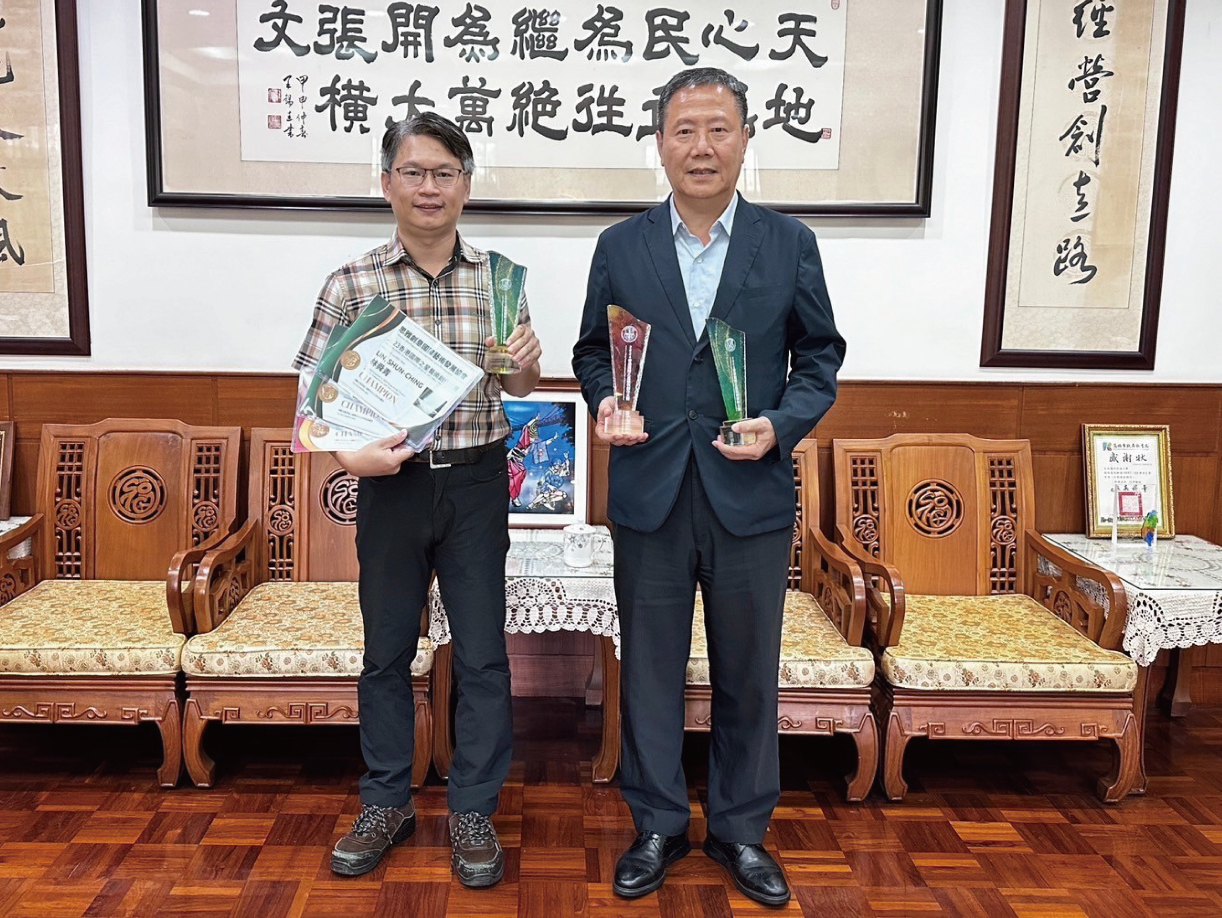 其中,商設系陳中聖老師所指導之工業設計群:「皮革工藝結合三圓交錯-曲木結構家具設計之研究」(團隊成員:張子葳、張凱琍、王柔錞)及護理與幼保群:「探討幼兒對飲食與飢餓認知於互動性教玩具之設計」(團隊成員:張念慈、洪佳儀、龔威嘉、蔡侑陵)皆獲得該類組第一名,這兩件作品亦甫獲得義大利A'Design Award & Competition 大獎,為校增添光采。