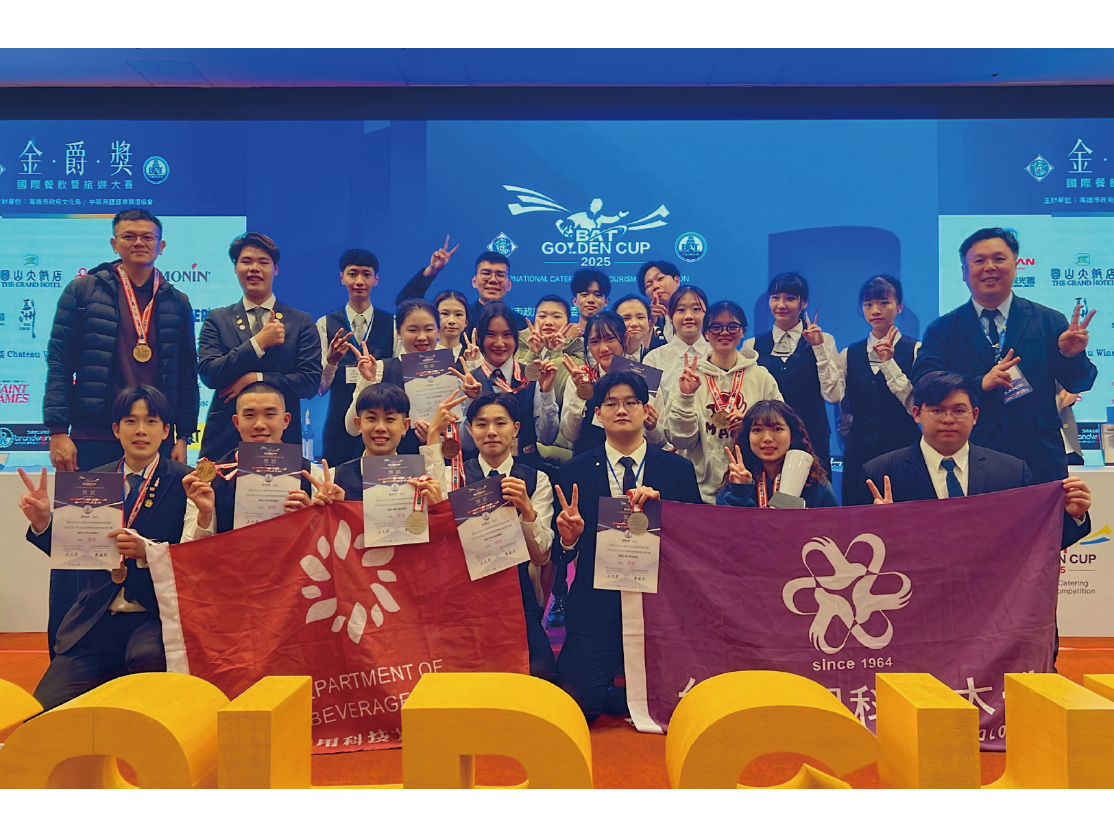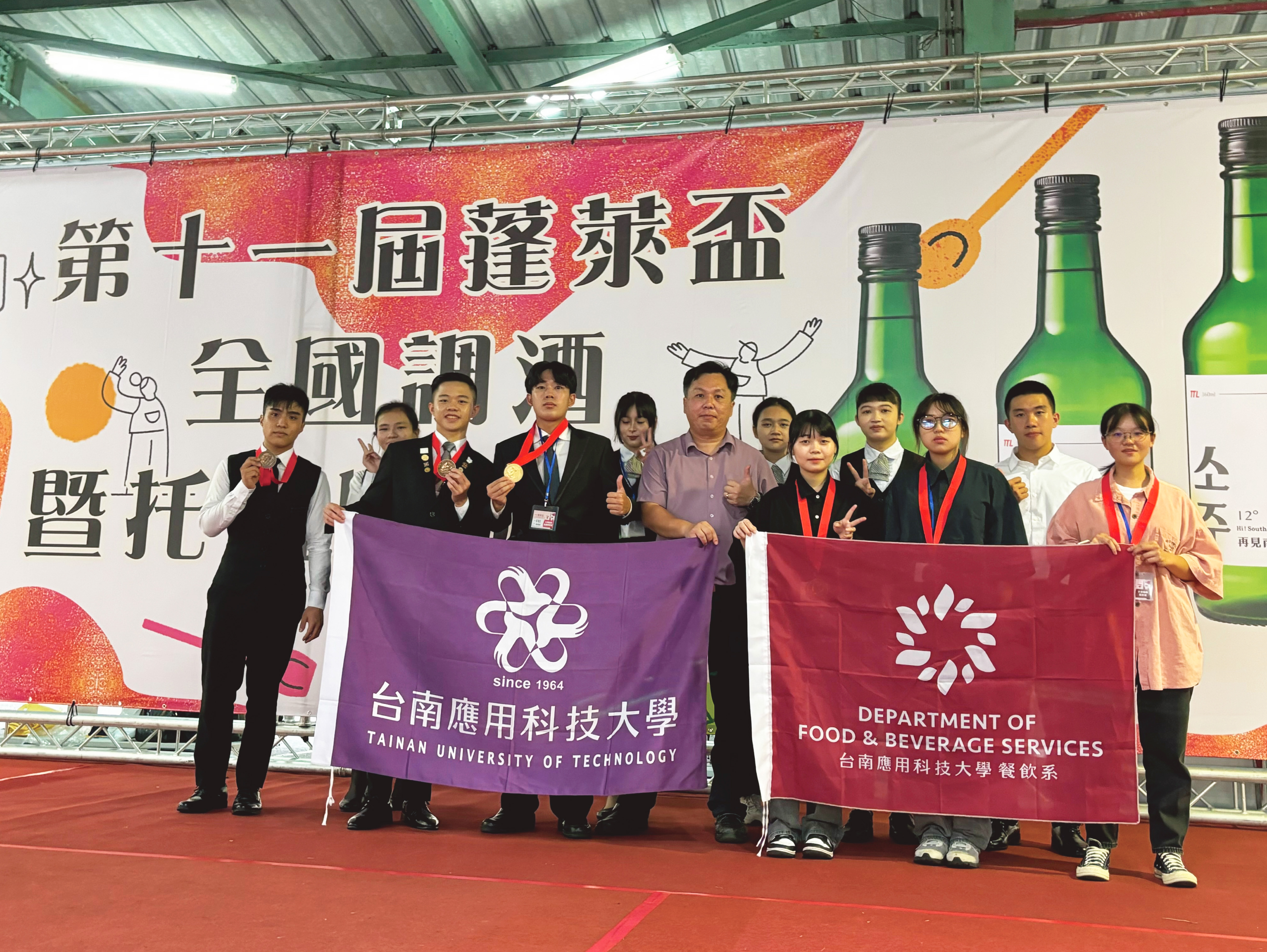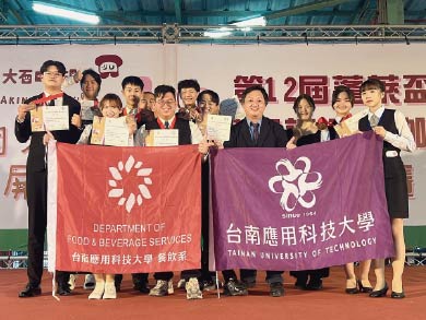 台南應用科技大學餐飲系學生參加「2025第24屆金爵獎國際餐飲暨旅遊大賽」,在全國多所大專校院與餐飲相關科系激烈競爭中,榮獲1金5銀13銅的頂尖成績,這次餐飲系由蔡振蒼老師帶領咖啡培訓隊、葉俊廷老師帶領的餐服培訓隊,以及鄭傑夫所率領的調酒培訓隊展現餐飲系平時紮實的專業訓練成果。