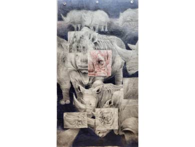 榮獲版畫類金牌獎得主盧芷苡同學先前已是國內各大獎項的常勝軍,對版畫創作抱有極大熱忱的她,平時在創作領域投入相當大的努力,其作品〈共影〉以複合版畫形式構成一幅層次豐富、內蘊深厚的畫面,各種物件片段的存在相互疊放交織,並且因綠底色紋路皺摺的襯托而將觀者拉回到記憶中的病房一景,似乎暗示看透了人生必經之生老病死;銅牌獎得主林冠斌的獲獎作品